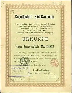 Participation certificate of the Gesellschaft Süd-Kamerun, issued 8. December 1898