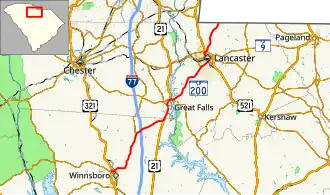 South Carolina Highway 200 (SC 200) is a 42.780-mile (68.848 km) primary state highway in the U.S. state of South Carolina. The highway travels more in a north–south direction, despite being signed as east–west. It connects the cities of Winnsboro, Great Falls, and Lancaster.