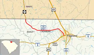 South Carolina Highway 207 (SC 207) is a 9.168-mile (14.754 km) primary state highway in the state of South Carolina. It is entirely within the boundaries of Chesterfield County and serves to connect the city of Pageland, South Carolina to the city of Monroe, North Carolina via North Carolina Highway 207 (NC 207).