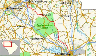 SC 215 is a two-lane rural highway that traverses for 95.7 miles (154.0 km) from Columbia to Spartanburg; connecting Jenkinsville, Carlisle, Union, and Roebuck.[6]