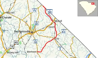 SC 381 traverses from Blenheim at SC 38 to the North Carolina state line where it continues as North Carolina Highway 381 into Gibson, North Carolina. As a two-lane rural highway, it connects the towns of Clio and McColl.[2]