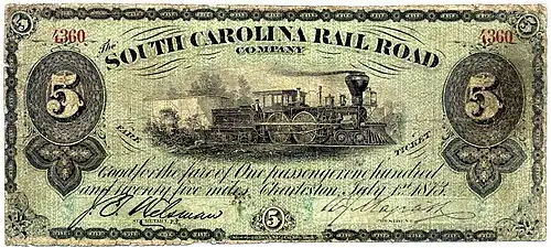 The South Carolina Rail Road Company was a railroad company that operated in South Carolina from 1843 to 1894, when it was succeeded by the Southern Railway. It was formed in 1844 by the merger of the South Carolina Canal and Rail Road Company (SCC&RR) into the Louisville, Cincinnati and Charleston Railroad Company. It was built with a track gauge of 5 ft (1,524 mm).[2]