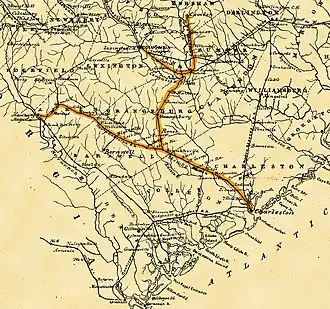 In 1840, the company constructed a 66.3-mile (106.7 km) railroad line between Branchville and Columbia, South Carolina,[3] and in 1848, the South Carolina Rail Road Company constructed a 37.1-mile (59.7 km) railroad line between Kingsville[6] and Camden, South Carolina.[3] In 1853, the company constructed a 1.8-mile (2.9 km) railroad, mainly a bridge over the Savannah River, from Hamburg, South Carolina, to Augusta, Georgia.[3]