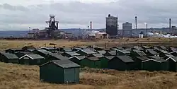 Near the end of the breakwater, in the fenced compound, there is a tall steel framed mast, housing air speed measurement devices. These devices gather data on wind speeds at various heights for a planned offshore wind farm proposed by Northern Offshore Wind Limited.[30] The mast is 164 feet (50 m) tall and 15.3 feet (4.7 m) wide at the base. Plans for the offshore wind farm include thirty 200 feet (61 m) windmills over 1 mile (1.6 km) offshore. AMEC Wind plans to build 19 wind turbines inside Corus steelworks generating 47.5 MW of electricity.[30]