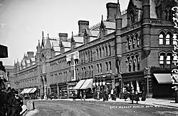 The South City Markets (today George's Street Arcade) opened in 1881 and were designed by Lockwood and Mawson.[9][11][12] One of the central landmarks the building is an ornate red brick and terracotta structure which originally housed a glass-covered marketplace. The market was gutted after a serious fire in 1892, and was replaced with intersecting arcades in a cruciform plan designed by William Henry Byrne. This interior has since be remodelled, but some original elements are still visible.[4] Bewley's café opened in 1894 and remained on the street until 1999.[13]