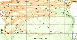 The Southern Pacific Gyre is part of the Earth's system of rotating ocean currents, bounded by the Equator to the north, Australia to the west, the Antarctic Circumpolar Current to the south, and South America to the east.[1] The center of the South Pacific Gyre is the oceanic pole of inaccessibility, the site on Earth farthest from any continents and productive ocean regions and is regarded as Earth's largest oceanic desert.[2] With an area of 37 million square kilometres, it makes up approximately 10% of the Earth's ocean surface.[3] The gyre, as with Earth's other four gyres, contains an area with elevated concentrations of pelagic plastics, chemical sludge, and other debris known as the South Pacific garbage patch.[4]