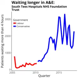 In May 2023, South Tees Hospitals NHS Foundation Trust became one of the first NHS hospital Trusts in England to achieve a Care Quality Commission ratings increase from 'Requires Improvement' to 'Good' since the start of the COVID-19 pandemic in 2020.[3]