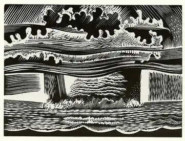 Hyde made Southern Cross to express his anger at American nuclear tests in the Bikini Atoll in 1946 following the atomic bombings in Japan.[11] He worked on it from 1948 to 1951.[11] Each image is 4 by 3 inches (10.2 cm × 7.6 cm),[12] centred at the top third of the page and with broad margins.[13] The one exception is of the bomb detonating, a 7 in × 6 in (18 cm × 15 cm) full-page image that bleeds off the page.[12] Hyde carved dynamic curving lines uncommon in wood engraving. Blacks overwhelms the figures they surround, and abstract images contrast with realistic detail in the flora and fauna.[6]