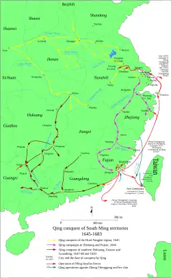 In February 1646, Qing armies seized land west of the Qiantang River from the Lu regime and defeated a ragtag force representing the Longwu emperor in northeastern Jiangxi.[41] In May of that year Qing forces besieged Ganzhou, the last Ming bastion in Jiangxi.[42] In July, a new Southern Campaign led by Manchu Prince Bolo sent the Zhejiang regime of Prince Lu into disarray and proceeded to attack the Longwu regime in Fujian.[43] Zheng Zhilong, the Longwu emperor's main military defender, fled to the coast.[43] On the pretext of relieving the siege of Ganzhou in southern Jiangxi, the Longwu court left their base in northeastern Fujian in late September 1646, but the Qing army caught up with them.[44] Longwu and his empress were summarily executed in Tingzhou (western Fujian) on 6 October.[45] After the fall of Fuzhou on 17 October, Zheng Zhilong defected to the Qing but his son Koxinga continued to resist.[45] Through Zheng networks, the Southern Ming continued to enjoy a privileged diplomatic position vis-a-vis Tokugawa Japan, who exempted Southern Ming ships from the ban on exports of weapons and strategic materials, and from the ban on Japanese wives of Southern Ming Chinese men remaining in Japan. The Zheng were also able to recruit Japanese troops, particularly from their strongest sympathizers, the Satsuma and Mito domains.[46]