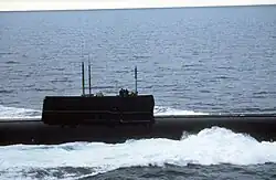 The submarine was powered by a pair of 177.4-megawatt (237,900 hp) VM-5M reactors, each supplying steam for the GTZA-618 steam turbine driving each propeller shaft. The turbines produced a total of 80,000 shaft horsepower (60,000 kW) that was intended to propel K-222 at a speed of 38 knots. The boat was equipped with two 3,000-kilowatt (4,000 shp) turbogenerators; two banks of 152-cell silver-zinc batteries were fitted in lieu of a diesel generator. The boat made 25 knots (46 km/h; 29 mph) on the surface,[8] and proved to be much faster than planned underwater and reached a top speed of 42 knots (78 km/h; 48 mph) at 90 percent power during her sea trials in December 1969. During this 12-hour full-speed test, some of the external hull fittings were ripped off and portions of the grills protecting the water intakes broke loose and were ground up by the water-circulation pumps.[6] One account of the trial wrote: