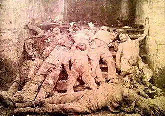 Torture was used on a wide scale in various prisons, especially in those prisons that were located in small towns. Prisoners were scalded with boiling water in Bobrka; in Przemyślany, people's noses, ears, and fingers were cut off and their eyes were also cut out; in Czortków, the breasts of female inmates were cut off; and in Drohobycz, victims were bound together with barbed wire.[44] Similar atrocities occurred in Sambor, Stanisławów, Stryj, and Złoczów.[44] According to historian, Prof. Jan T. Gross: