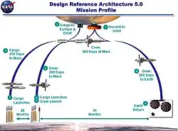 An example architecture from the mid-2010s of a human spaceflight mission to Mars, as envisioned by the United States space agency, NASA.