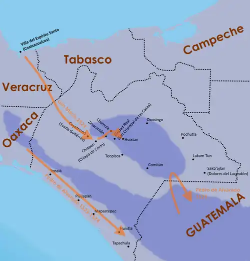 A year after Luis Marín's reconnaissance expedition, Pedro de Alvarado entered Chiapas when he crossed a part of the Lacandon Forest in an attempt to link up with Hernán Cortés' expedition heading for Honduras.[180] Alvarado entered Chiapas from Guatemala via the territory of the Acala Chʼol; he was unable to locate Cortés, and his scouts eventually led him to Tecpan Puyumatlan (modern Santa Eulalia, Huehuetenango),[181] in a mountainous region near the territory of the Lakandon Chʼol.[182] The inhabitants of Tecpan Puyumatlan offered fierce resistance against the Spanish-led expedition, and Gonzalo de Alvarado wrote that the Spanish suffered many losses, including the killing of messengers sent to summon the natives to swear loyalty to the Spanish Crown.[41] After failing to locate Cortés, the Alvarados returned to Guatemala.[182]