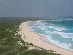 The Yucatán Peninsula is bordered by the Caribbean Sea to the east and by the Gulf of Mexico to the north and west. It incorporates the modern Mexican states of Yucatán, Quintana Roo and Campeche, the eastern portion of the state of Tabasco, most of the Petén Department in Guatemala, and all of Belize.[6] Most of the peninsula is formed by a vast plain with few hills or mountains and a generally low coastline. The northwestern and northern portions of the Yucatán Peninsula experience lower rainfall than the rest of the peninsula; these regions feature highly porous limestone bedrock resulting in less surface water.[7] In contrast, the northeastern portion of the peninsula is characterised by forested swamplands.[7] The northern portion of the peninsula lacks rivers, except for the Champotón River – all other rivers are located in the south.[8]