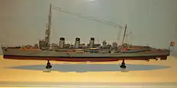 In October 1927, King Alfonso XIII signed a royal decree reorganizing the Spanish Navy.[1] In the new organization, Blas de Lezo′s squadron was no longer called the Training Squadron, and Alfonso XIII, Jaime I, and two new light cruisers which were about to enter service, Almirante Cervera and Príncipe Alfonso, were assigned to it.[1] In addition, the decree created a Cruiser Division — composed of Blas de Lezo, Méndez Núñez, and the light cruiser Reina Victoria Eugenia — which was subordinated to the squadron.[1]