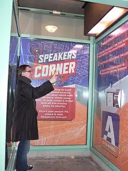 Speakers Corner began in 1990 with a video booth outside the Citytv studios in Toronto.[2] The booth's original intent was for viewers to record news commentary and "letter to the editor" segments for broadcast on CityPulse,[1] but the booth soon proved so popular, with many segments being recorded that fell far outside the initial concept, that the decision was soon made to create a full half-hour weekly series.[1] Segments that were relevant in a news context continued to appear on CityPulse,[3] and entertainment-oriented segments also sometimes appeared on other CHUM television outlets, such as MuchMusic and Space, as interstitials. (The concept pre-dated CITY, with Keeble Cable pitching the idea in 1970.)[4]