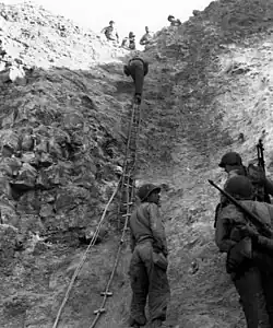 Training and assessment started immediately on arrival, with the volunteers having to complete an 8-mile (13 km) march with all their equipment from the Spean Bridge railway station to the commando depot.[29] Exercises were conducted using live ammunition and explosives to make training as realistic as possible. Physical fitness was a prerequisite, with cross country runs and boxing matches to improve fitness. Speed and endurance marches were conducted up and down the nearby mountain ranges and over assault courses that included a zip-line over Loch Arkaig, all while carrying arms and full equipment. Training continued by day and night with river crossings, mountain climbing, weapons training, unarmed combat, map reading, and small boat operations on the syllabus.