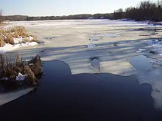 Spirit Lake near its outlet. The photo was taken during a late winter thaw.