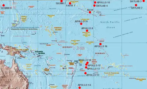 | Apollo 4 | NASA | November 9, 1967 | 30°06′N 172°32′W / 30.1°N 172.53°W | USS Bennington | 16 km (9.9 mi)[74] | |