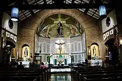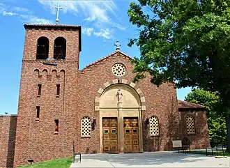 The first Italian immigrants arrived in Des Moines in the 1870s, with most arriving between 1880 and 1915.[2] They followed the streetcar lines to areas south of the Raccoon River. Davenport Bishop Henry Cosgrove appointed the Rev. Francis Leonard to found St. Anthony's parish in 1898, but difficulties arose and the project came to an end. In 1906, Cosgrove assigned the Rev. Victor Romanelli to found the parish on Des Moines' south side. Romanelli was a native of Naples and had served parishes in New York and New Jersey. He acquired an old fire station where he resided and where the parish's first Mass was celebrated on August 19. Property was acquired on Columbus Avenue and a small brick church was built there. The Rev. Michael Flavin, the pastor of St. Ambrose Church opposed the establishment of the parish and incorrectly insisted it was established as an Italian ethnic parish because he did not want to lose the parish territory or income.[2] The Des Moines Diocese was established in 1911 and St. Anthony's transferred to the new diocese. A second floor was added to the church building and the parish school was opened in 1912 with the Congregation of the Humility of Mary providing the faculty. By 1956 it was the largest school in the diocese.[2] The present brick Romanesque Revival church was built in 1931 during the pastorate of the Rev. Cornelius Lalley (1928-1955).[3]