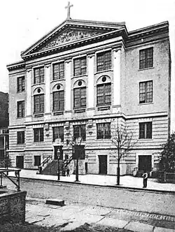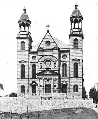 The parish was canonically established in 1849 as the Bronx began attracting German and Irish residents. The first mass was held in a private residence on Boston Road.[8] The Morrisania site for the present church on the northeast corner of Franklin Avenue and Jefferson Street was purchased in 1850 with a small wooden church immediately being erected. This in turn was replaced in 1858 by one of brick construction and dedicated by Archbishop John Hughes.[6] In 1892, the parish address was at 867 Jefferson Street.[9] That structure was destroyed in 1894 during a fire and the present structure was dedicated in 1895.[6]