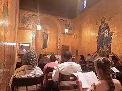 ![]() The new church opened in 1924, after two years of construction, and was consecrated in 1925. The Los Angeles Times reported that the last service in the old church was "rife with tender memories" and an "added charm and reverence pervaded the occasion."[9] When the new church opened the following week, the Times called it "one of the most beautiful and costly edifices in the country."[10] Another report noted: "Critics declare it the most beautiful in Los Angeles."[11] Built at a cost of $650,000 (approximately $9.17 million in 2023[12]), the church was described at the time as a "close copy of an Italian church of the sixth century in built at Toscanella."[10] The church's walls are made of reinforced concrete two and a half feet thick clear to the roof, and the structure is 69 feet from floor to ceiling.[11] The wood-beamed ceiling is a reproduction of a church ceiling from the 11th century at San Miniato, near Florence.[11] The altar is made of Italian marble, and the triptych was carved by Oberammergau workmen.[11] The interior includes a stained glass window featuring Martin Luther King Jr., installed in 1977. Other windows include a Romanesque rose window. Another striking feature of the church is found in the gold mosaics on the chapel walls. One mosaic depicts the Virgin Mary and Christ child modeled after a 13th-century mosaic at the Cathedral of Santa Maria Assunta in Torcello, Italy. There is also a mosaic of Jesus as judge, holding a Bible and giving a blessing, a 12th-century convention.[8] At the time the new church opened in 1924, St. John's had 2,000 communicants on its membership list and was the largest Episcopal church west of Chicago.[11] In 1947, The Seven Angels mosaics were added to the church at a cost of $150,000 (approximately $1.61 million in 2023[12]). The figures of the angels, each eight feet high and holding a musical instrument, were made of Italian marble with gold mosaic and stand in arched panels. The mosaics were created in Italy by five artists who spent two years working on them.[13] ![]() |
