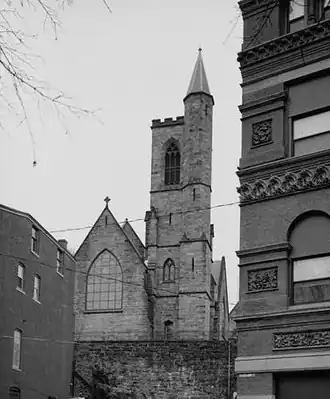 This church was designed by Richard Upjohn and was officially consecrated on October 25, 1869. The church is a late work of Upton's, and represents a relatively pure version of the Gothic Revival, well removed from the stylistic elements of the Greek Revival that he began his career with.[3] It is a stone structure, built primarily out of local gray stone, with red stone as trim. It is set partly on natural terrace in a steeply sloping hillside, which has been extended and supported by a stone retaining wall. The church has a cruciform plan, with a square tower rising at the northeast corner. The outer corner of tower is extended by an octagonal stair turret, which rises a short way beyond the crenellated tower top to its own conical roof. The interior is tiered with the entrance and a small chapel at the lowest level, an intermediate level which houses Sunday School rooms and the church office, and then the main sanctuary on the third floor. The interior is lavishly appointed, with English Minton tile, Black Walnut, and stained glass windows by Louis Comfort Tiffany and Charles Gibson. There are also several commissioned works of fine art, including brass work by J.R. Lamb, a 24 karat gold illumination, and several hand carved pieces.[3]