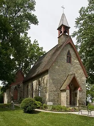 The original portion of the church was built in 1849 and is rectangular in shape, with two-foot-thick walls, 17 feet tall, constructed of rough-cut native limestone. It is enclosed by a stone wall which was built in 1922 and surrounded on its eastern, southern, and western sides by a cemetery of 173 markers. The church features a wooden portico covered with a wooden Gothic Revival roof and a steeple, which rises another 12 feet and includes the original bell and electronic carillon.[2] The building was closed for a brief period following the Battle of Antietam in 1862, but was reopened and has held services continuously ever since.