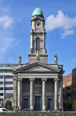 The church was designed by Patrick Byrne and built between 1835 and 1844, not long after Catholic emancipation. The front has a granite portico with four Ionic columns. The three-stage Italianate bell tower, with its copper dome, was completed in 1843 and is a visual focal point along the quay, except where blocked by the dome of the Four Courts to the east. The inclusion of a clock, less common in Catholic Churches, implies a sense of public responsibility thus increasing the status of the building.[8]