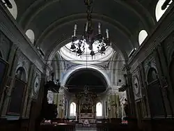 The church entrance is west. Above the wooden front door there is a rose window decorated with floral ornaments and a dove. These were added in the years after 2000, while the original very high and arched door was transformed into a wall, where the rose window was put, and the church painted in yellow. Its original colour used to be white and silver-grey. The facade is divided by pilasters and arches of a more intense yellow (which used to be originally silver-grey) of Corinth that the rest of the structure.