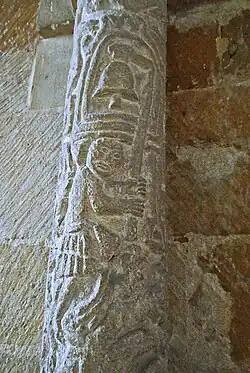 The chapel and north wall of the chancel have Norman stonework. The chancel arch contains Norman carvings on the shafts either side of the arch;[6] on the south shaft is a man pulling on a bell-rope.