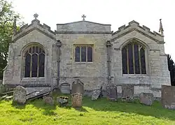 The 1448 south chapel sits on a moulded plinth which runs over two twin-stepped buttresses, one angled and central to the south wall, the other diagonal on the south-east corner. The buttresses are topped by square-based pinnacles with blind cusped panels, crocketed above gables at each side, the pinnacle at the south-east finished with a finial. The parapet is embattled with moulded coping, which runs as a gable end at the east end and includes a central cross above. At the roof line at the base of the parapet and the buttress tops runs a moulded cill band—angled projection that allows water to flow from a building face—which continues around the east side and follows the line of the gable end. Either side of the south wall buttress is a three light window with cinquefoil heads, with six panels above with trefoil heads, enclosed in a moulded surround, and set with stained glass. The window opening has a flattened arch above the spring with a following hood mould. The 1460–70 north chapel also sits on a moulded plinth. Its angle buttresses are similar style to the south chapel, including cill band, although four in number on the north wall defining three external bays with three windows. These and the chapel east window are all of three lights with simple 'Y' tracery and cinquefoil heads.[1][8]