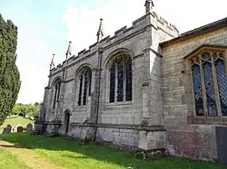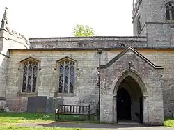Attached to the nave are the north and south aisles. The north aisle contains at its east two 19th-century windows of three lights set within a straight edge openings under gabled hood moulds. Tracery is of 15th-century panel style, with a central quatrefoil rosette inset, and reflects a true 15th-century window at the west wall. North aisle windows are clear glazed within diagonal muntins. A single step angled buttress supports the aisle north-east corner. To the west of the aisle north windows and above the east of the porch is the aisle roof's single gargoyle-headed drain. The gabled porch at the west of the windows is 13th-century, its doorway with a pointed chamfered arch from the spring of part octagonal responds—half-piers attached to walls supporting an arch—with octagonal capitals. Attached to the responds to the height of the capitals is a cast iron double-gate. The porch interior contains a stone bench each side, and an inner doorway with 14th-century three-mould arch and hood mould with label stops.[1] The panelled porch door has metal-studded deep stiles and rails, the panels with intermediate and arch-headed mullions.