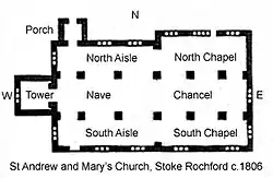 The oldest parts of the church are the nave, essentially Norman, and a west tower hood mould which could be 11th-century (Pevsner). Chancel chapels were added in the 15th century: the south in 1448 by Ralph Rochford, and the north in 1460–70 by Henry Rochford, brother of Ralph. The Rochfords, who came to England under the Norman Conquest, took their name from the town of Rochford in Essex, and gave their name to the Stoke-Rochford manor and parish.[8][16] Rochford family members include a soldier in Edward III’s French wars who was charged with the safety of John II of France during his captivity at Somerton Castle, Lincolnshire, a commissioner of Lincolnshire banks and sewers (fenland drainage), one given authority by Richard II to oversee horse and cattle selling in Holland and Kesteven, and between 1344 and 1409, six becoming High Sheriffs of Lincolnshire. Sir Ralph Rochford, who provided for the building of South Stoke St Mary's south chapel, was granted at Stoke free warren—hunting privilege from the King in 1448 on condition of preventing exploitation by others—a position previously held by John de Neville of Ganthorpe during the reign of Edward II. A sculptured high relief slab, possibly of John de Neville and his wife, was found in a field at Ganthorpe now lies in the north chapel, having been installed in the 19th century. Henry Rochford who added St Mary's north chapel, and who in 1427 had received lands, house and buildings at North and South Stoke, was the last with Stoke's Rochford family name. He married Elizabeth Scrope (d.1503). She was the daughter of Henry Scrope, 4th Baron Scrope of Bolton who owned the neighbouring manor of Easton, and the widow of Sir John Bigod of Mulgrave Castle, Yorkshire who was killed at the Battle of Towton during the Wars of the Roses. Upon the death of Henry Rochford, Elizabeth married Oliver St John (d.1497), son of the Duchess of Somerset, and step father of Margaret Beaufort who was mother of Henry VII. The bodies of Oliver St John and Elizabeth are buried beneath a black marble slab with brass inscriptions in the South Stoke church chancel. The South Stoke manor passed to Joan, the daughter of Henry Rochford, and through marriage and purchase to Stanhope, Skeffington, Ellys, Fountain, Heale and Harrison families. In 1637 Sir John Harrison passed by moiety the manor to his daughter Margaret (1627–1679), who married Edmund Turnor Esqu (1619–1707). Edmund Turnor was knighted in 1663 as a reward for his loyalty to Charles I.[6][15][17][18]
