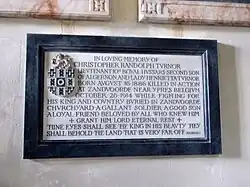 An oblong marble plaque of white field with black framing, and containing an embossed heraldic shield surmounted by a lion crest, is to Christopher Randolph Turnor (1886–1914), who was a lieutenant in the 10th Royal Hussars, killed near Ypres, Belgium, and buried in Zandvoorde; he was the son of Algernon and Lady Henrietta Turnor. Above this plaque are two others, both of a black recessed field, surrounded by a raised figured pink and white marble frame incised with flat straight grooves and square corner devices with embossed details. One is dedicated firstly to Elizabeth Turnor (died 1801 aged 27), first wife of Edmund Turnor (1755–1829), and daughter of Philip Bowes Broke (commander of HMS Shannon in the capture of USS Chesapeake); and secondly to Edmund Turnor's second wife Dorothea (died 1874 aged 77 years). The second is to Edmund Turnor (died 1806 aged 89 years)—who was the father of Edmund Turnor (1755–1829)—and his wife Mary (died 1818 aged 86 years). A further memorial of double dedication is of a white bolection moulding surrounding two raised plaques on a black field; all marble. Both dedications mention Reginald Charles Turnor (1850–1910); the first for his first wife Gabrielle (died 1898 at Cannes), the daughter to Marquis Sampieri, and whose ashes are held behind the memorial; the second for his death as a major of 1st Life Guards, and the husband of Laura Leticia Turnor. Below this double dedication is a plaque to Laura Letitia Turnor (1872–1952).[18][30]