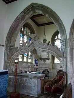 The nave arcades run through to corresponding chancel arcades separating the north and south chancel chapels from the chancel. The chancel three-bay north arcade is 14th-century Decorative, with piers quatrefoil in section separated by right-angled projections running full length, and with flat raised fillets along each face. The capital gadrooned (convex and concave) raised acabi mouldings follow the lateral line of the cusped piers. The 15th-century arcade arches springing from the piers are also of a continuous Decorative multi-faceted moulding with a flat under-face. The chancel south arcade is 15th-century. Its piers are Perpendicular, with polygonal piers and capitals and chamfered arches. The furthest east south arcade contains within it a supplementary Decorative arch springing from the piers, this of ogee form with multi-rounded moulding, topped with a twin run of decorative battlements leading to a flat topped finial; this arch was rebuilt in the 19th century. At each side within the westernmost chancel bays are 19th-century wooden choir stalls. Screens facing the stalls are of cusped ogee arches and quatrefoils in open fretwork moulding; the altar rail is of similar style. Behind the stalls are pews, originally belonging to the manor houses of Easton and Stoke Rochford. Between the aisles and chancel chapels at the north and south are 19th-century low wooden screens, with a run of seven double panels; plain below, those above with decorative insets, the central and outer of quatrefoils. Above the paneling runs open fretwork moulding of cusped ogee arches leading to quatrefoils between, below a top rail. Beneath the chancel east window is a 1911 stone reredos sculptured in relief, and painted, by Mrs. G. F. Watts. A raised central panel depicts the crucifixion of Christ with, at each side, three saints within triple-arched niches: the saints Hugh of Lincoln and Gilbert of Sempringham, and the Virgin Mary to the left; St John, Bishop King of Lincoln and St Christopher to the right.[1][8][22] The base projection contains a scalloped bed-mould. A decorative frieze of serpentine foliage is set at the top. Above the reredos is the Perpendicular-style three-light east window with 19th-century stained glass.