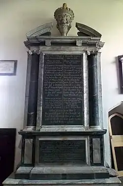 The monument is described by Kelly's Directory as: "richly carved and gilt, and upon the base within arched recesses are kneeling effigies of the parents, and in smaller recesses effigies of two sons; intermediate columns support a cornice of panel work, enriched with armorial bearings and ornaments"[6][16] The stone monument was originally completely painted and gilded. Henry and Elizabeth sit within an aedicule and kneel facing each other in prayer either side of a gabled ark, in front of which lies a covered small child with head on pillow. Columns flank the figures, beyond which kneels a further figure of a son each side, set in front of an arched recess under a portico of four columns, and slightly set back; plinths above the canopies are topped with plain square tapered black columns as pinnacles.[1][6][8] The columns either side of Henry and Elizabeth are headed by Corinthian capitals that sit beneath an architrave, frieze and cornice that continue across the monument but set back. Below the set back frieze, and enclosing scrollwork and a memorial plaque, is a chamfered arch with a spandrel each side containing a roundel with embossed decoration. On the frieze run recessed oblong panels separated by relief heads. Above the cornice the line of the columns is continued by plinths, supporting tapered pinnacles topped by moulding and ball. Above the set back cornice is a complete heraldic achievement set within square columns decoratively embossed, and with scrollwork as support at the sides, and topped by a further architrave, frieze and cornice reflecting those below, above which is further scrollwork.