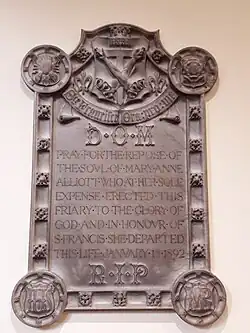 Construction of the friary started in 1890 and it was designed by the architect Frederick Walters, who also designed the nearby St. John's Seminary in Wonersh. It was financed by a £7,000 bequest from Mary Anne Alliott who was the aunt of the founder of the friary, Fr Arthur Wells. On 18 June 1892 the friary and church was dedicated and consecrated by the Bishop of Southwark. The friary was built to serve as a novitiate for the Franciscans in Britain.[3]