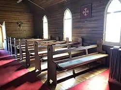 The community banded together and came up with a plan to accomplish the work quickly. Following the construction of a stone house, now in Harmony Lane, there was no more stone available in the area. Money was raised for a ship to be chartered by the community to bring an entire cargo hull of strong Canadian pine to build the church and line the interior walls. The pine wood was hardwearing and some of the beams were 14 to 18 feet in length so they could build it quickly in the time they had. Some houses in the area are made from pine that was left over.