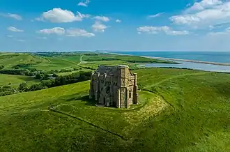 Although no records survive of the chapel's construction, the chapel has been dated in style to the late 14th century, the same time as Abbotsbury's tithe barn was built.[3] The chapel is built on a definite platform which could have been originally for a pagan temple.[4] St Catherine's Chapel was built as a place of pilgrimage and retreat by the monks of the nearby Benedictine monastery Abbotsbury Abbey, which the chapel overlooks high up on the hilltop. Its position on the top of a hill about 80 m (260 ft) high, overlooking the coast from Portland Bill to Bridport, meant that it was a prominent feature for seafarers. Only a handful of chapels of the same kind are located outside the precincts of the monasteries who constructed them. The isolated setting of the chapel granted the monks to withdraw from the monastery during Lent for private prayer and meditation.[5]