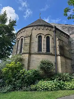 The outer walls of the church are constructed of red sandstone with grey ashlar dressings; the roofs are slate.[26][27] The church plan consists of a nave, with a square tower to the west and a chancel and apsidal sanctuary to the east. There is a clergy vestry at the south-east corner of the building.[28]