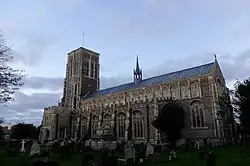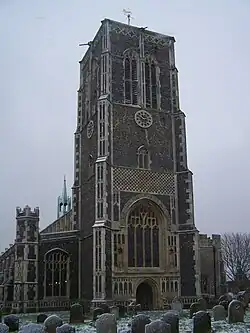 The church is renowned for its East Anglian flushwork, especially that of the tower. Knapped and unknapped flints are arranged in patterns, textures and designs and create the stone work. The curving letters over the west window are most famous: SCT. EDMUND ORA P. NOBIS (St Edmund pray for us). Each letter is crowned, and set in knapped flints. Originally roofed in lead, from 1948 to 2015 the church had a copper clad roof with an easily recognisable flèche (or spirelet), above a clerestory of eighteen windows. The flèche was purely for display, and has never contained a bell. The tower has no parapet and is a very fine piece of architecture, with its large bell openings. The roof of the nave is so high that it makes the tower seem shorter than it really is; but it is 96 feet (29 metres) high.[4] All of the church's medieval glass was destroyed by William Dowsing in 1644; the only stained glass windows in the church are the east windows over the altar (1954, by Sir Ninian Comper) and the west window below the grand tower. In World War II the church was narrowly missed by a German bomb that destroyed houses in the nearby Hollyhock Square. The bomb did not do much damage to the building itself but blew out most of the windows - another reason why the church has very little stained glass. The church was tidied very quickly for the funerals, a short while later, of the people killed by the bomb.