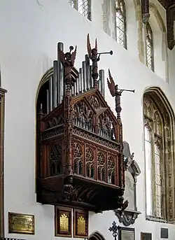 The church has a three manual pipe organ, originally built by J. W. Walker & Sons Ltd in 1887 and later rebuilt by the Thaxted firm Cedric Arnold, Williamson & Hyatt in 1966. The specification, drawn up by Sir Frederick Ouseley, a Professor of Music at Oxford University, may be found on the National Pipe Organ Register.[10]