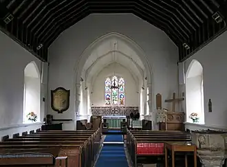 In a survey recorded in 1751, two bells were noted in the west end and the nave and chancel were thatched.[3] The present single bell, marked "chapel of Ely house, London", is dated 1769. The 19th-century roof is of collar rafter type. The two centred chancel arch, 19th century, have two moulded orders, the inner on engaged colonnettes.[6] The 1980 vestry conversion included toilet, refreshment facilities and improved access for the disabled.[12]