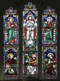 The previously thatched roof has been plain tiles since the extensive restorations of 1863.[6] The east gable of the nave, rebuilt in 1665, is of narrow local brick.[2] The 19th-century west gable end has a gabled double bellcote with two-centred arches and one bell installed. The 19th-century west window has three trefoil lights. The North and South walls of the nave have, in each wall, one window of three cinquefoil lights in ogee arches and square head. The clunch tracery and the mullion and architrave are of limestone, which may indicate they are part of an earlier restoration. The gabled, brick and rubblestone north porch is 19th century. The chancel has in the north wall two windows, each of two cinquefoil lights in four centred arch. The restored east window has three cinquefoil lights and has an original label with mask stops. The windows in the south wall were restored c. 1980.[6]
