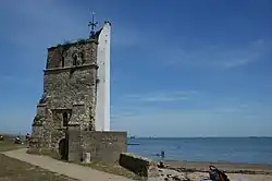 The original church of St. Helens was in a bad state as far back as the 16th century, according to the presentment of George Oglander, the centoner of St. Helens.[3] By the 18th century it had become so ruinous that a new church was built and the old church allowed to go to ruin. The tower, a 13th-century structure, was the only part left standing, and can still be seen today. The garden at the rear of the old Church tower was the parish burial ground from the time of the first church until the 18th century.[2] The tower was bricked up and painted white as a seamark for Navy ships in 1719.[1]
