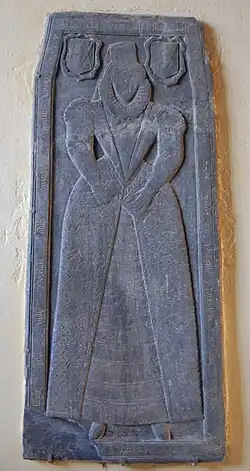 A rare contemporary slate memorial tablet survives, commemorating Margaret Smith (died 1579) and the work of the stonemason Peter Crocker.[5]