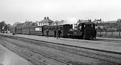 St John's Railway Station (Manx: Stashoon Raad Yiarn Valley Keeill Eoin) was on the Isle of Man Railway (IMR), later merging with the nearby station of the Manx Northern Railway (MNR); it was the junction of lines to Douglas, Peel, Ramsey and Foxdale. It was close to Tynwald Hill. The station began life in 1873 as the penultimate stop on the Peel Line, the island's first passenger railway line; it consisted of a simple wooden waiting shelter with accommodation for the station master, and a passing loop. This layout remained until the arrival of the new line from the north in 1879 when a second station was established, later merging with the existing one. The station was the hub of the island's railway network, where the lines to Douglas, Peel, Ramsey and Foxdale met.
