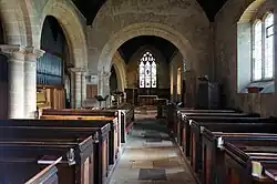 The church is built of Magnesian Limestone and has a Welsh slate roof. The nave is of three bays, with a north aisle and chapel.[1] Its south door is the most notable feature, with a round head with three orders of decoration, including carvings of various human figures, and human and animal heads.[3] There are various pointed windows, those in the chancel and chapel being Perpendicular. Inside, the columns are carved as clusters, with water-leaf capitals. The decoration of the chancel arch includes small animals. In the north chapel is an alabaster tomb, dating from the 16th century, depicting Thomas Wharton, 1st Baron Wharton and both his wives. The windows are 20th century and include a mention of Hieu, who founded nearby Healaugh Park Priory. The clock dates from the later 18th century, and was rebuilt in 1911.[1][2]