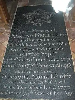 The medieval font stands underneath the west tower, there is a small statue of the church's patron Saint Lawrence in an alcove on the north side while the floor has ceramic tiling. There are two memorial slabs to the Britiffe family who were local gentry that rose up the social ladder from modest beginnings, they had strong connections with Hunworth for two centuries. Edmund and his wife Rebecca, who built nearby Hunworth Hall and its adjacent barns, lie beneath a memorial slab in the church nave. Edmund's son, also Edmund, who was a civil servant, and his daughter Henrietta are buried under an ornate marble slab nearest the altar.[5]